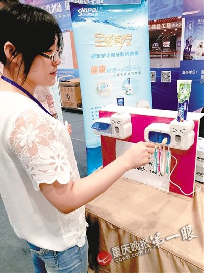 多功能牙刷消毒盒,横向空间可以挂牙刷。接上电源后,盒子会自动亮起紫外线灯、负离子对牙刷消毒。竖向的盒子有一个孔,牙膏可直接倒立在里面,需要用牙膏时,不再需要用手挤,把牙刷伸进一个孔里,触动按键就会挤牙膏。