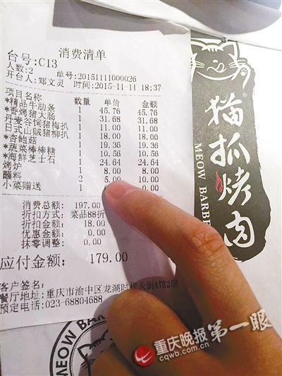 她介绍,11月11日,她在猫抓烤肉大坪店就餐后,发现账单上多了这样一项标注:烤炉8元。“我们叫来服务员询问这是什么费用,对方解释这是给我们换烤盘的费用,每桌8元,不管换多少次烤盘,都是8元。我吃过这么多次烤肉,收取烤盘费还是第一次听说,如果商家不提供烤盘,我们未必直接把肉在火上烤起吃吗?”赵小姐觉得这项收费没道理。