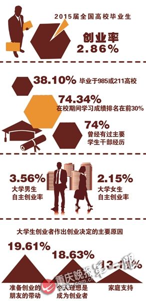 昨日发布的教育部哲学社会科学发展报告项目《中国大学生就业创业发展报告》显示,大学生创业者对当前的创业政策和环境做出较高评价,2015届全国高校毕业生创业率为2.86%。