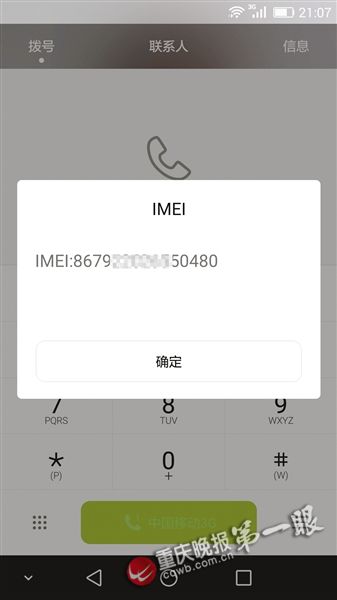?昨日,重庆晚报编辑用手机键盘输入*#06#,出现了专属自己手机的电子串号。