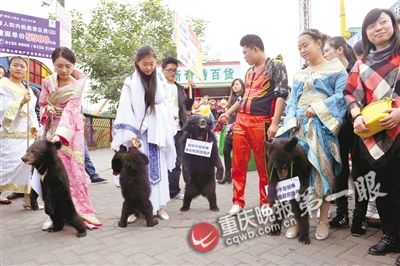 重庆晚报记者现场看到,穿着汉服的美女牵着四只狗熊到处转,狗熊身上挂着“房市不是熊市,我们看好房地产”的牌子,还有“建面5500元起/平方米”的标语(如图)。