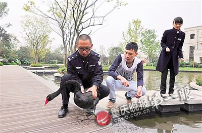 重庆晚报讯 昨日,一只走失的黑天鹅在北部新区民警和热心市民的帮助下,被送到重庆动物园。