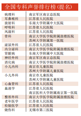 对患者而言,最具指导性的当属专科声誉排行。此次参加专科排行的共有34个临床专科,江苏地区医院收获不小。