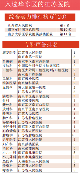 南京地区医院多个专科在华东地区“数一数二”,比如江苏省人民医院的康复医学排第一、南京军区南京总医院肾脏科排第一。中国医学科学院皮肤病医院皮肤科排第二、南京医科大学附属口腔医院(江苏省口腔医院)排第二、南京鼓楼医院风湿科排第二、南京脑科医院精神医学排第二。