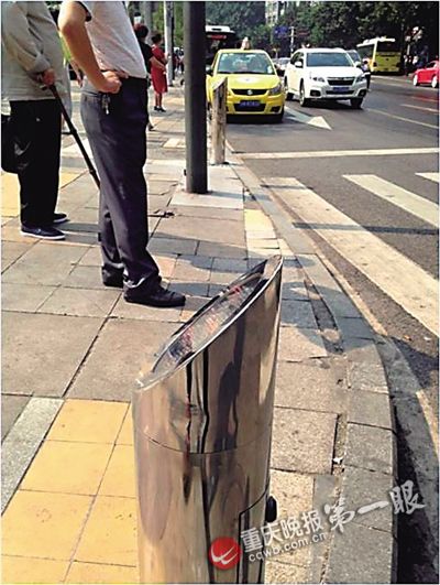 昨天,渝中区交巡警介绍,发出声响的是不锈钢圆柱,一体式智能红外感应语音提示器,通过智能检测行人和人行红绿灯状态,通过人性化的语音方式,提醒盲人和行人及低头族横过斑马线。