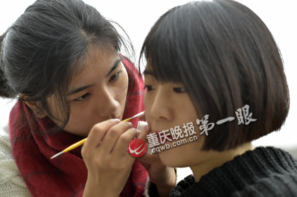 “刚开始练习,我们两人就对坐,她给我化妆,我给她化。”程程说,一画就是几个小时。为了检验化妆成果,她们自拍后发给朋友,朋友们都不敢相信是同一个人。