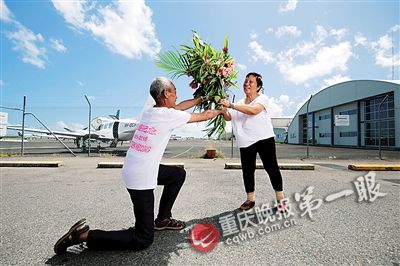 谈及那天求婚和跳伞的一幕,昨日接受重庆晚报记者越洋采访的顾全平夫妇仍然非常激动。顾全平在电话那头笑着告诉重庆晚报记者:“以前从未想过要出国玩,这次太开心了,天天有新的发现,这个世界太大、太好了!我要学英语,我现在可以说good morning,Thank you了!我还要学唱歌、吹笛子。我想通了,天天开心最重要。我现在最想对老太太说:我爱你一辈子。”