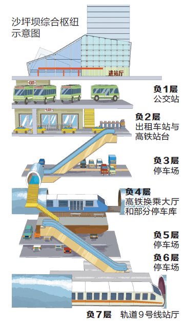 负1层是公交站、负2层是出租车站与高铁站台、负3、负5、负6层是停车场、负4层是换乘大厅和部分停车库、负7层是轨道9号线站厅。