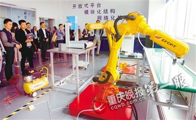 在位于永川区凤凰湖工业园的重庆市机器人·数控机床高端智能装备产业基地内,重庆晚报记者看到一排排机械手正在娴熟地干活。工作人员介绍,这个名为六自由度机器人的工业机器人共有6个活动关节,可以轻松提起100公斤的重物,不但能从事搬运、焊接等作业,还可以与数控机床等智能装备配合建成无人生产线,甚至可以一台机器人操作几台数控机床。