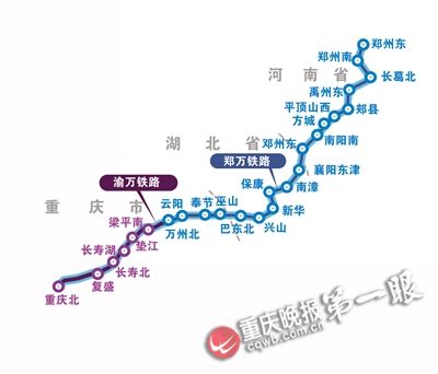 报告显示,郑万铁路自郑州东站引出,经河南省、湖北省进入我市,最终接入在建的渝万铁路万州北站。全线设郑州东、郑州南、长葛北、禹州东、郏县、平顶山西、拐河北(越行站)、方城、南阳南、邓州东、襄阳东津、南漳、保康、新华、兴山、巴东北、巫山、奉节、云阳、万州北共20座车站,我市境内线路长约181公里,设4个站。
